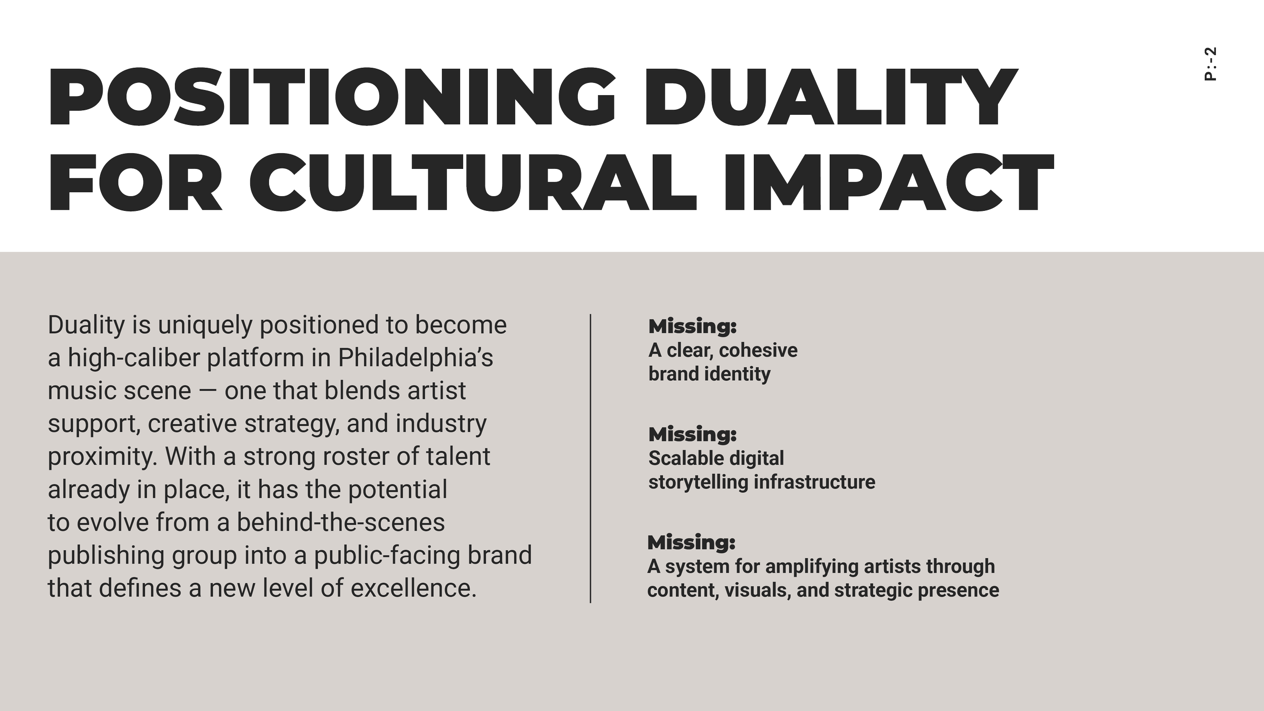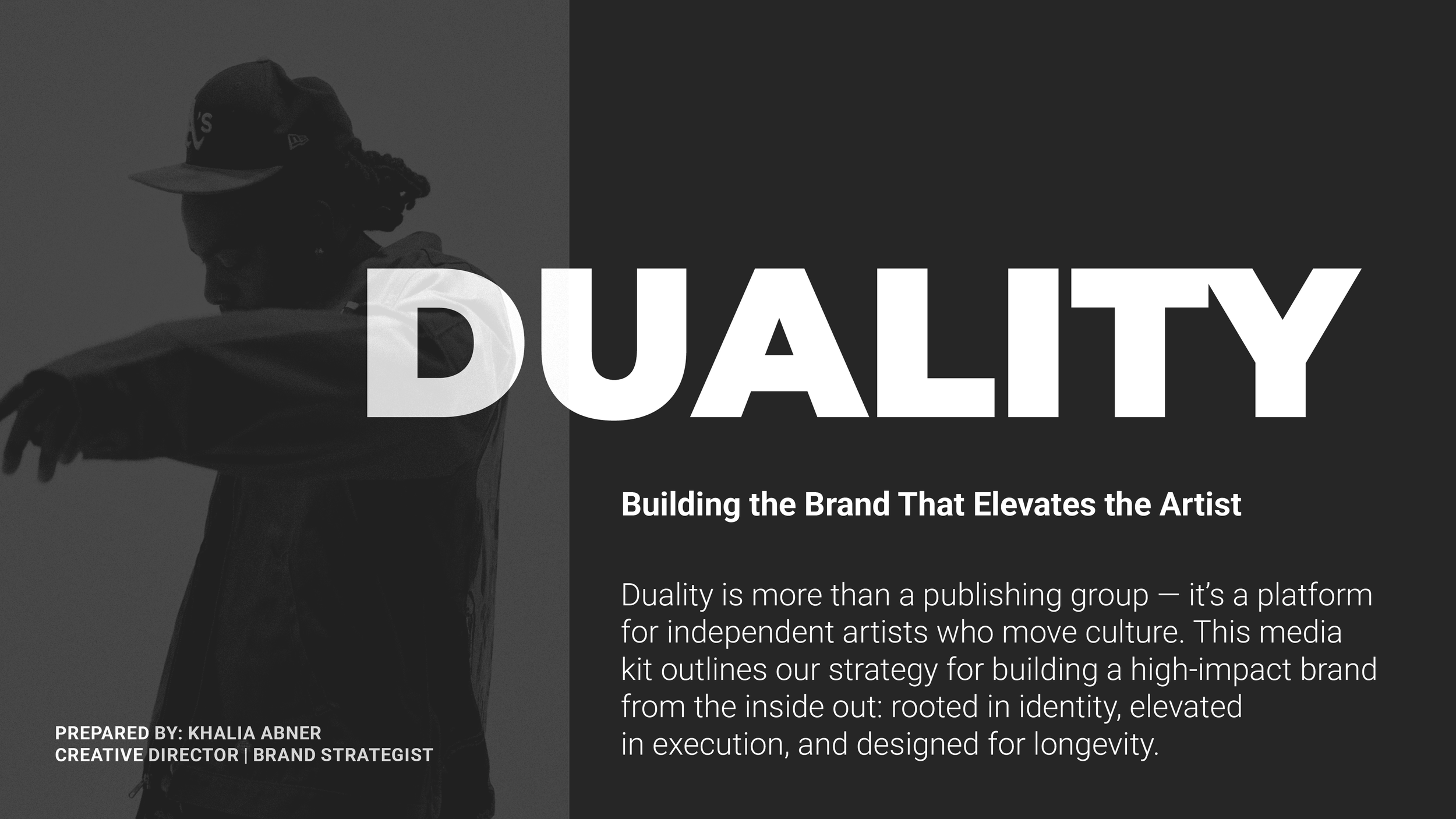 I developed a comprehensive brand proposal for Duality, a Philadelphia-based publishing collective affiliated with Warner Chappell Music. The project aimed to transform Duality from a loosely organized group into a structured, culturally resonant brand capable of nurturing and elevating independent artists.