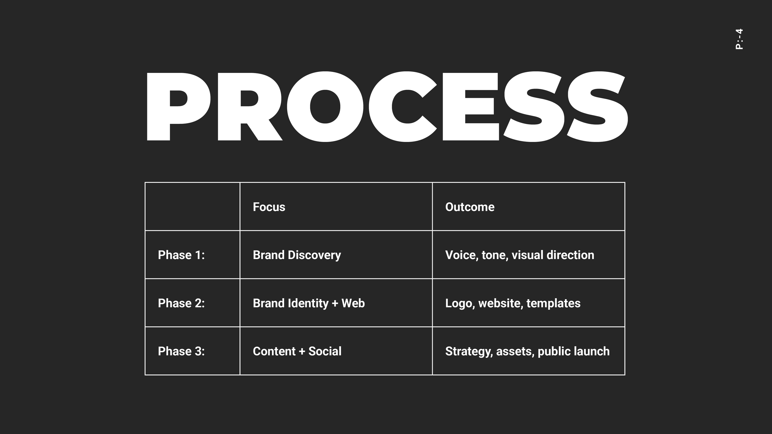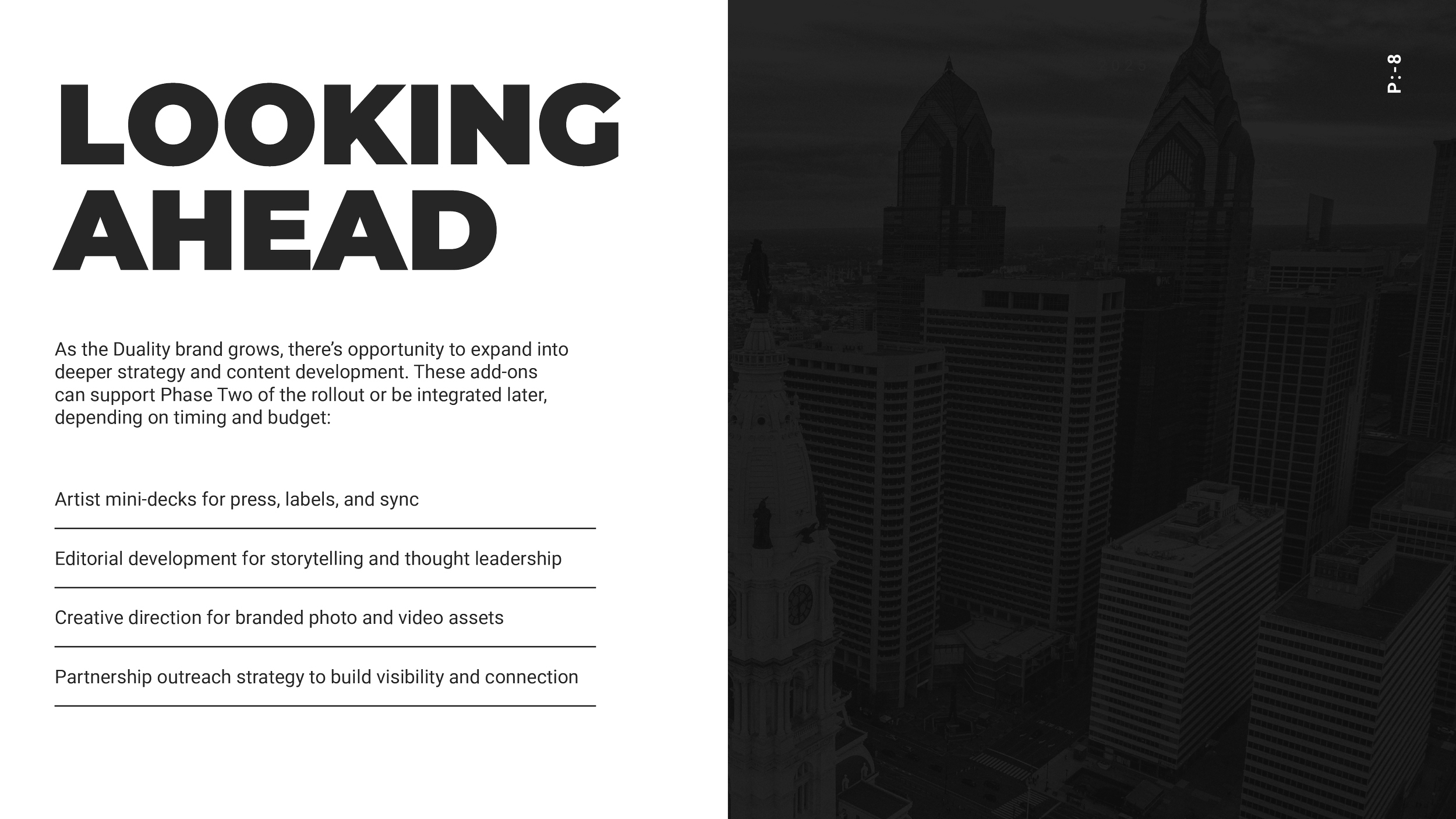 The proposal introduced a multi-phase strategy focused on brand clarity, artist alignment, and community engagement. Phase One centered on research and discovery—interviewing the founder and five signed artists to define Duality’s purpose, values, and role within Philadelphia’s music ecosystem. Subsequent phases detailed brand identity development, digital infrastructure, and high-end visual storytelling designed to position Duality as a trusted creative hub within Warner Chappell’s network.